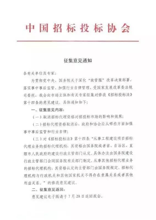8月8日消息:7月31日,受國家發改委法規司委托,中國招標投標協會將組織市場主體、業內專家學者,就《招標投標法》第十四條關于工程招標代理機構資質管理的條款修訂收集意見。