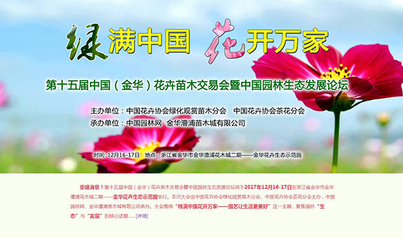 重磅消息!第十五屆中國(金華)花卉苗木交易會(huì)暨中國園林生態(tài)發(fā)展論壇將于2017年12月16-17日在浙江省金華市金華澧浦花木城二期——金華花卉生態(tài)示范園舉行。本次大會(huì)由中國花卉協(xié)會(huì)綠化觀賞苗木分會(huì)、中國花卉協(xié)會(huì)茶花分會(huì)主辦,中國園林網(wǎng)、金華澧浦苗木城有限公司承辦。