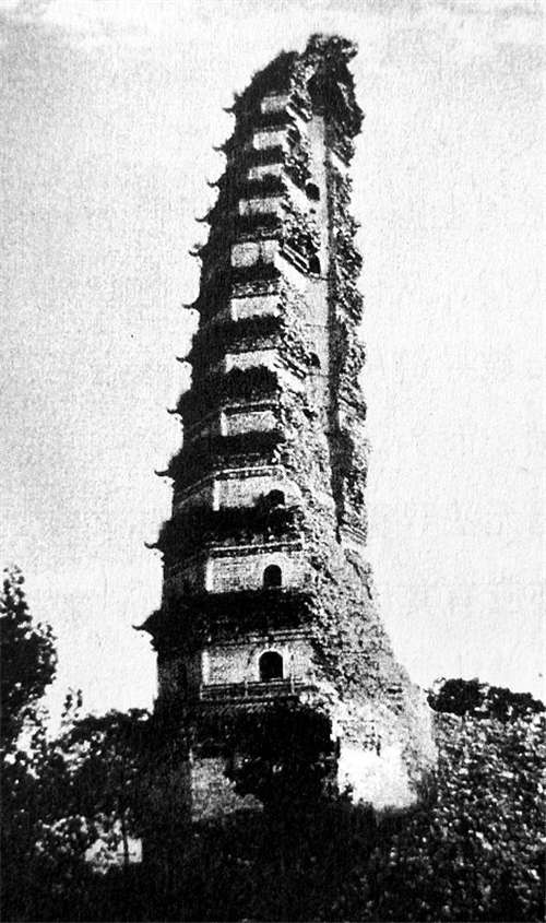 明代的隆慶年間法門寺倒了以后,法門住持的僧人準(zhǔn)備用自己的力量集資。他用苦刑的辦法,就是用很重的兩個(gè)鐵鎖掛在一百只長鐵鏈上,然后穿透鎖骨、拖地而行到各地化緣。大家看到這樣的場面就覺得他是真心要修寶塔,都紛紛捐錢。但是錢還是有限的,所以到明代萬歷7年才開始修建13級的磚塔(后來也倒塌了),一直修到萬歷37年,整個(gè)修了30年。