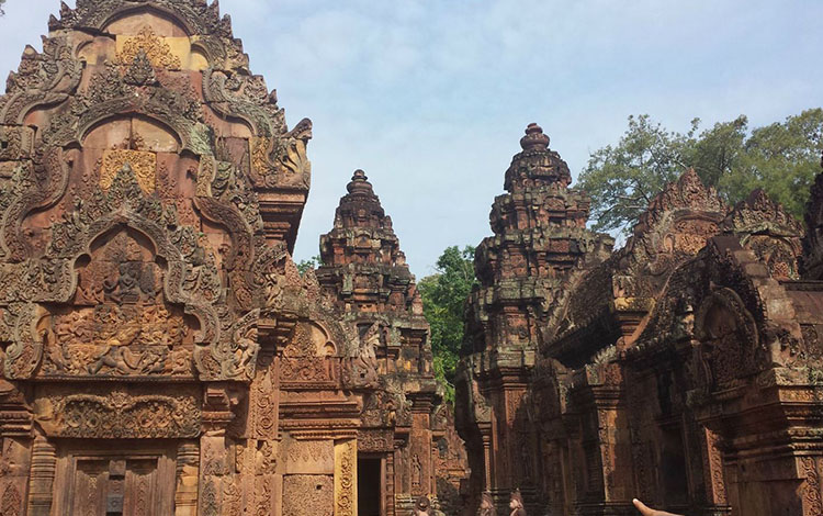 門南的一尊飛天女神浮雕,是寺廟內(nèi)獨一無二露齒微笑的飛天女神。由圍墻包圍的寺廟大廣場,占地面積82公頃。除去位居中央的寺廟,這一片廣場是古代城市和王宮的遺址,王宮遺址在寺北。如今古城和古王宮都蕩然無存,滿地被森林覆蓋,只遺留下一些街道的輪廓。