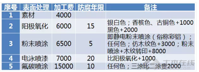 ②表面處理方式:陽極氧化、粉末噴涂、電泳噴漆、氟碳噴涂等價格依次升高。