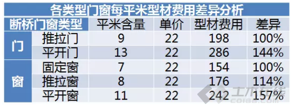 【成本要點】不同于塑鋼型材,目前市場主流的鋁型材均為國產品牌,彼此之間差價很小,影響型材價格最大的因素在于隔熱條。進口隔熱條優(yōu)于國產隔熱條,但兩者約2000元/噸的成本差異是否值得?以1500*1500窗為例,2000元/噸的差價折合窗單方兩者差價約18元/㎡,若窗地比為0.2,折合建筑單方即為3.6元/㎡。