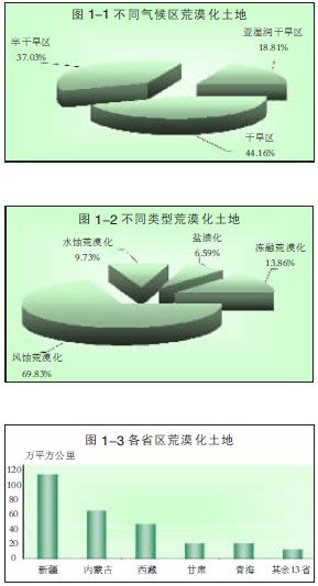 截至2009年底,全國荒漠化土地總面積262.37萬平方公里,占國土總面積的27.33%,分布于北京、天津、河北、山西、內(nèi)蒙古、遼寧、吉林、山東、河南、海南、四川、云南、西藏、陜西、甘肅、青海、寧夏、新疆18個省(自治區(qū)、直轄市)的508個縣(旗、區(qū))。