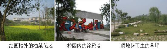 四川美術學院以原始的生態為基礎,保持了地理原貌。后期的植物栽種也沒有破壞原有的平衡。路邊載有大課的銀杏,山地上保持原有的植物,如竹。有栽種大片的農作物,小徑邊上也有果樹點綴。這種依照原貌的綠化布置不僅使整個校園美觀而獨特,并且在防噪,避暑上也大有功勞。川美的綠化布置一直是川美校園規劃的一大亮點,整體鄉村田園式的風格給人僻靜優雅的感覺,也符合大學城周邊的景觀,適應美院學生對于藝術的學習。