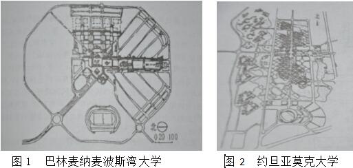 首先,校園的詳細規劃和建筑設計,由只重視“讀書——課堂”,單純傳授知識,近乎“書齋”式的概念,轉變到還須重視人與人、人與環境、學校與社會等相互關系的概念。即要創造學生之間交流、“誘人”相互交往的室內室外空間、學校環境對美育的功用以及高等學校與外校方便的聯系。這些交流的問題的解決在規劃層面來說主要可以放在校舍的布置和組合問題上。“近年來,歐洲新建的大學較多的使用所謂‘魚脊’式的布局把一系列標準單元的單體建筑物串起來。國外另一個布局形式是網格式,整個校園用統一的模數劃成網絡式,建筑物按網格組合,有利于標準化和擴建。又丹下健三都市·建筑研究所規劃和設計的巴林麥納麥波斯灣大學(圖1)及約旦亞莫克大學(圖2),有的在東西和南北兩條軸線上分別布置不同功能的房屋,‘以軸分區’。”②不同類型不同時期的學校有著各自不同的規劃(圖4)④這些規劃布局形式都有啟發性。而同處大學城的重慶大學與四川美術學院,地理和氣候幾乎完全相同。