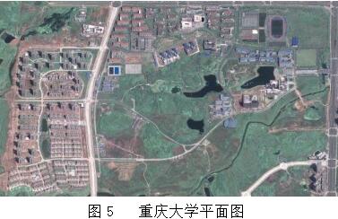 重慶大學(圖5),一條大學城的主交通公路分隔開了教職工宿舍與教學區。建筑分布較川美而言要密集很多。總體上是將山地推平而分為三大區域,教學區,運動區,休閑區分區明顯。有兩條交叉的主要交通軸線,建筑的朝向較為統一。類似“樹干式”的建設模式,以公共圖書館和行政大樓為樹干,以各院系和科為枝葉,形成枝葉繁茂,緊密相連,有機整體的新模式體系。由于重大是所綜合性的大學。因此集中的大型綜合樓對這所大學的交流而言會非常重要。設計寬闊的廣場,大的湖泊和草坪對其在交流上也會起到促進作用。