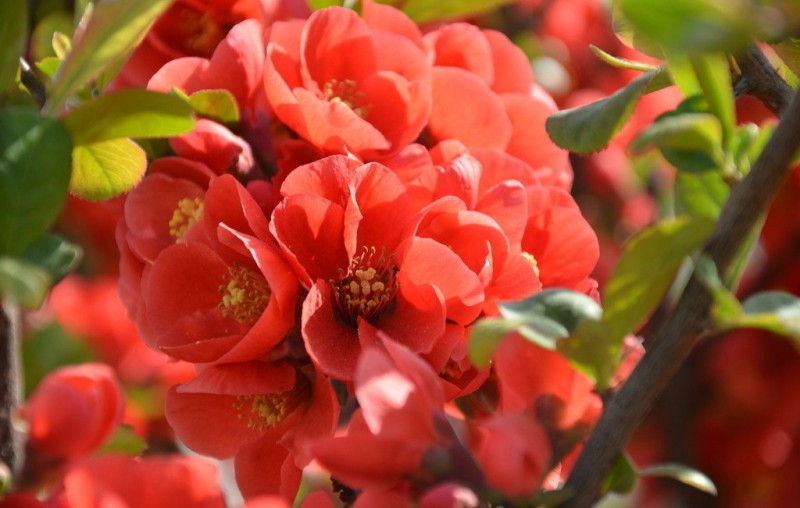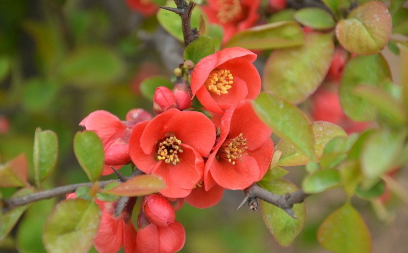 貼梗海棠花梗極短,花朵緊貼在枝干上,故而得名。