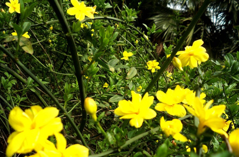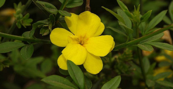 云南黃馨為常綠灌木,枝細(xì)長拱形,柔軟下垂,斷面為四棱形,小枝無毛。三出復(fù)葉,對生,小葉長橢圓狀披針形,基部漸狹成短梗,側(cè)生2枚較小而無柄。3~4月開花,花單生于小枝端部,淡黃色,有葉狀苞片。