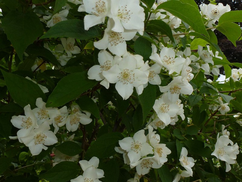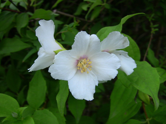 Philadelphus L. 山梅花屬,虎耳草科,約75種,我國(guó)約有15種,大部供觀賞用。該屬物種為直立灌木,枝具白髓;單葉對(duì)生,基部3~5主脈。花萼 、花瓣各4,雄蕊多數(shù),蒴果4瓣裂。