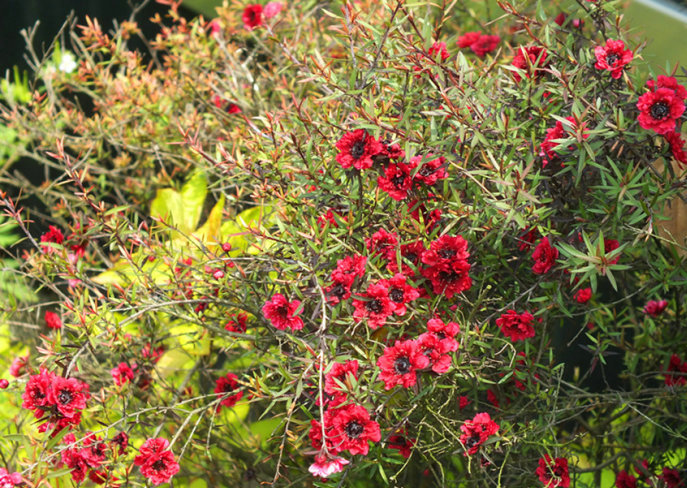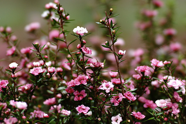松紅梅(Leptospermum scoparium)常被稱作新西蘭茶樹,高2米的灌木,粉白泛桃紅的花朵也是重要花材。