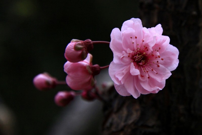 美人梅:落葉小喬木。葉片卵圓形,長5~9厘米,紫紅色。花粉紅色,繁密,先花后葉。花期春季,花色淺紫,重瓣花,先葉開放,萼筒寬鐘狀,萼片5枚,近圓形至扁圓,花瓣15—17枚,小瓣5—6梅,花梗1.5厘米,雄蕊多數,自然花期自3月18日第一朵花開以后,逐次自上而下陸續開放至4月中旬。