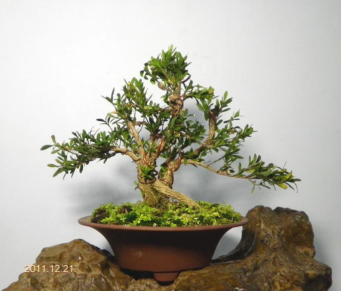 雀舌黃楊盆景主干長勢特慢,非常蒼勁,但嫩枝條長得較快,葉的密度必然拉長,就顯得軟散,惟有用“摘心”來控制,才能保證觀賞價值。就是在枝條沒有木質化之前,留一對,最多兩對嫩葉片,其余摘掉或剪掉,在適當的水,肥等條件下,十天半月它就會發出兩個嫩芽來。就這樣周而復始,它的枝條顯得短而粗,葉片可以2的積數倍增,不斷提高觀賞價值。再就是要及時摘除花苞。雀舌黃楊在夏秋之前就開始有花苞了,春天開花,花果所需營養要占全樹的70%-80%,這樣必然影響它正常生長和美觀,我們是以觀葉為主。所以必然從見花苞開始,就要把它摘除。