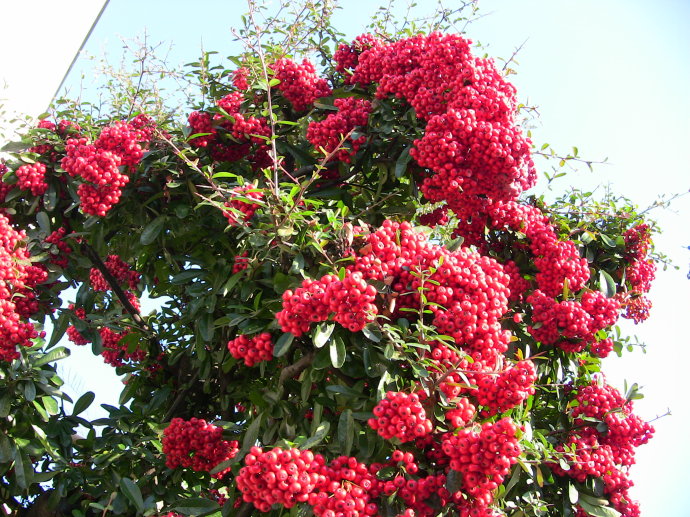 火棘(Pyracantha fortuneana (Maxim.) Li),常綠灌木或小喬木,高可達(dá)3m,通常采用播種、扦插和壓條法繁殖。 火棘樹形優(yōu)美,夏有繁花,秋有紅果,果實存留枝頭甚久,在庭院中做綠籬以及園林造景材料,在路邊可以用作綠籬,美化、綠化環(huán)境。具有良好的濾塵效果,對二氧化硫有很強吸收和抵抗能力。以果實、根、葉入藥,性平,味甘、酸,葉能清熱解毒,外敷治瘡瘍腫毒,是一種極好的春季看花、冬季觀果植物。